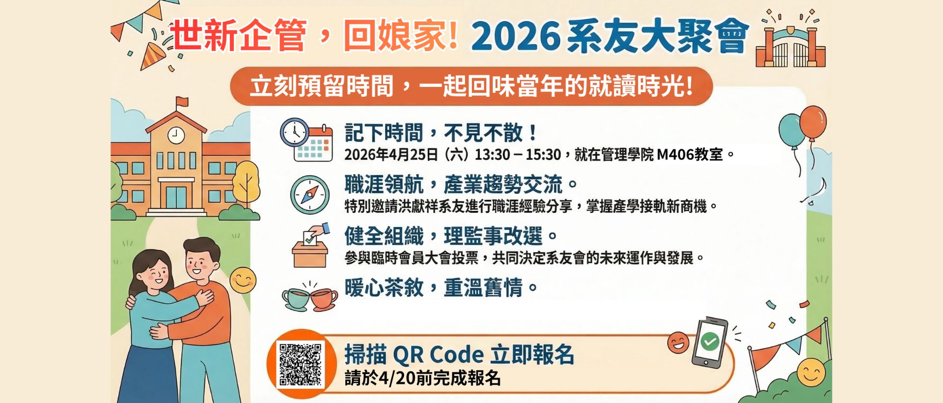 時光飛逝,不管您畢業了多久,世新企管永遠是您溫暖的家!為了凝聚歷屆系友的向心力,並增進跨屆情誼與產學交流,將於 2026年4月25日(星期六) 舉辦「世新大學企業管理學系系友回娘家暨臨時會員大會」。我們誠摯地邀請您回到熟悉的校園,與昔日同窗及在校師長重溫美好的青春回憶!